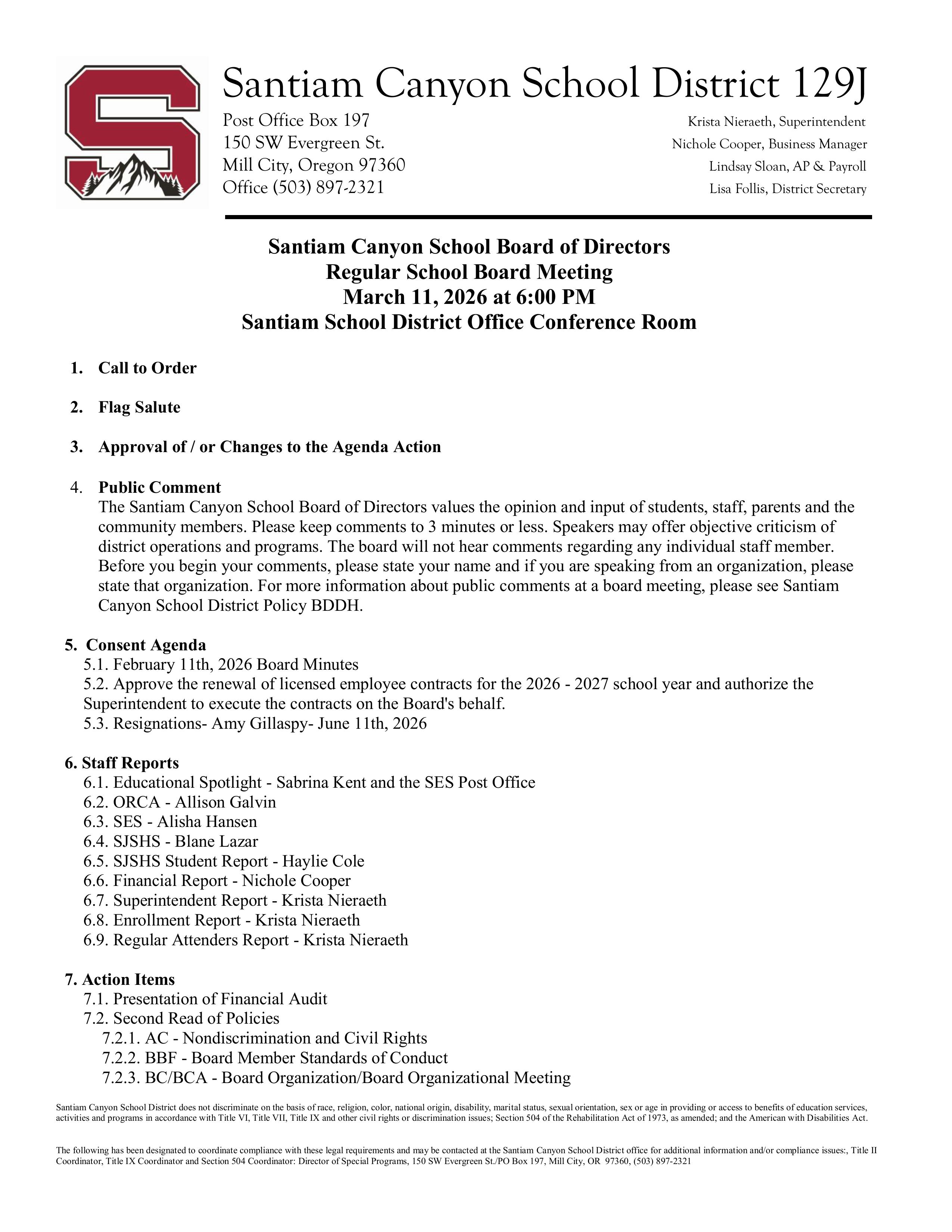 The Board of Directors of Santiam Canyon School District will have their monthly meeting on Wednesday, March 11th, at 6pm at the District Office Conference Room. The meeting agenda is below. You ca...