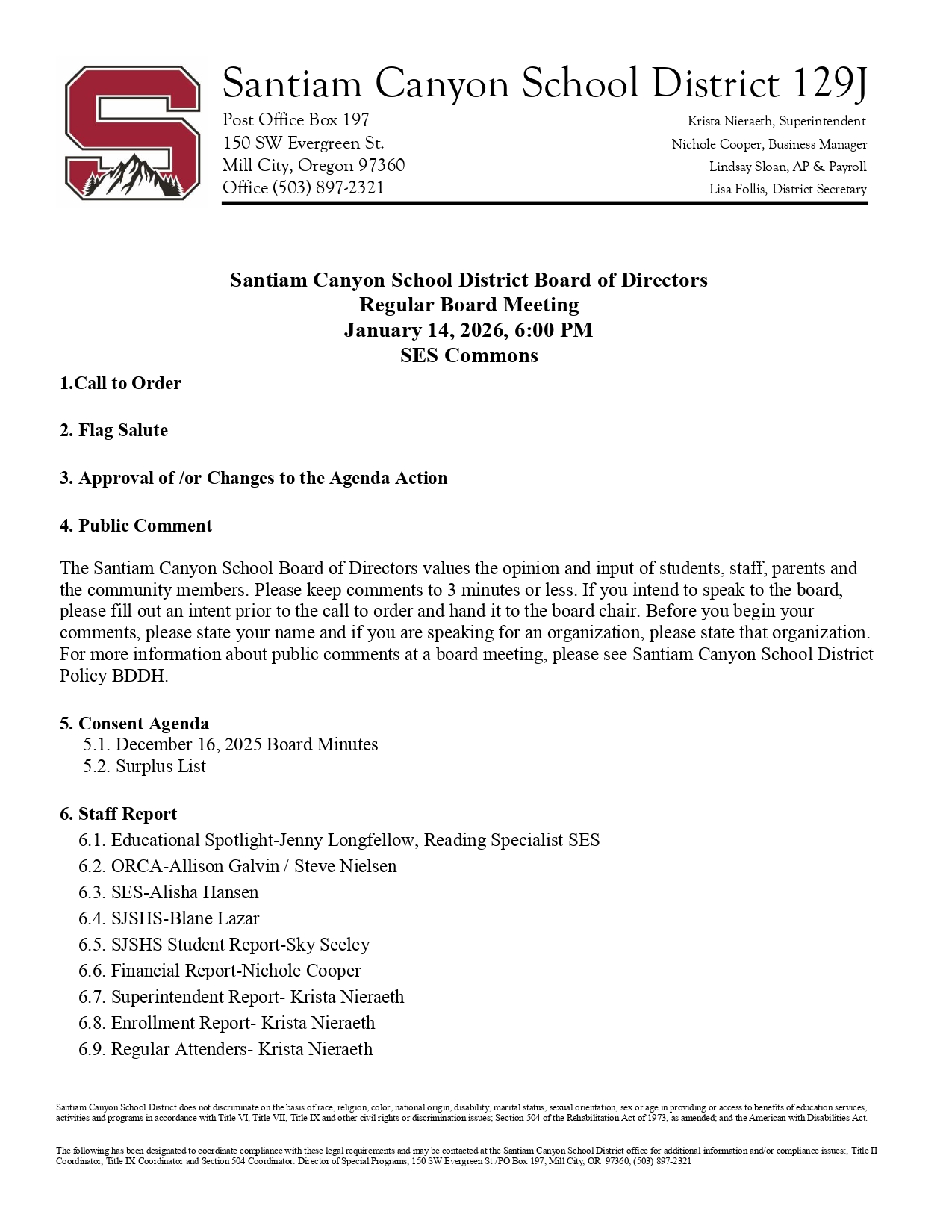 The Board of Directors of Santiam Canyon School District will have their monthly meeting on Wednesday, January 14th, at 6pm at the SES Commons. The meeting agenda is below. You can also find the me...