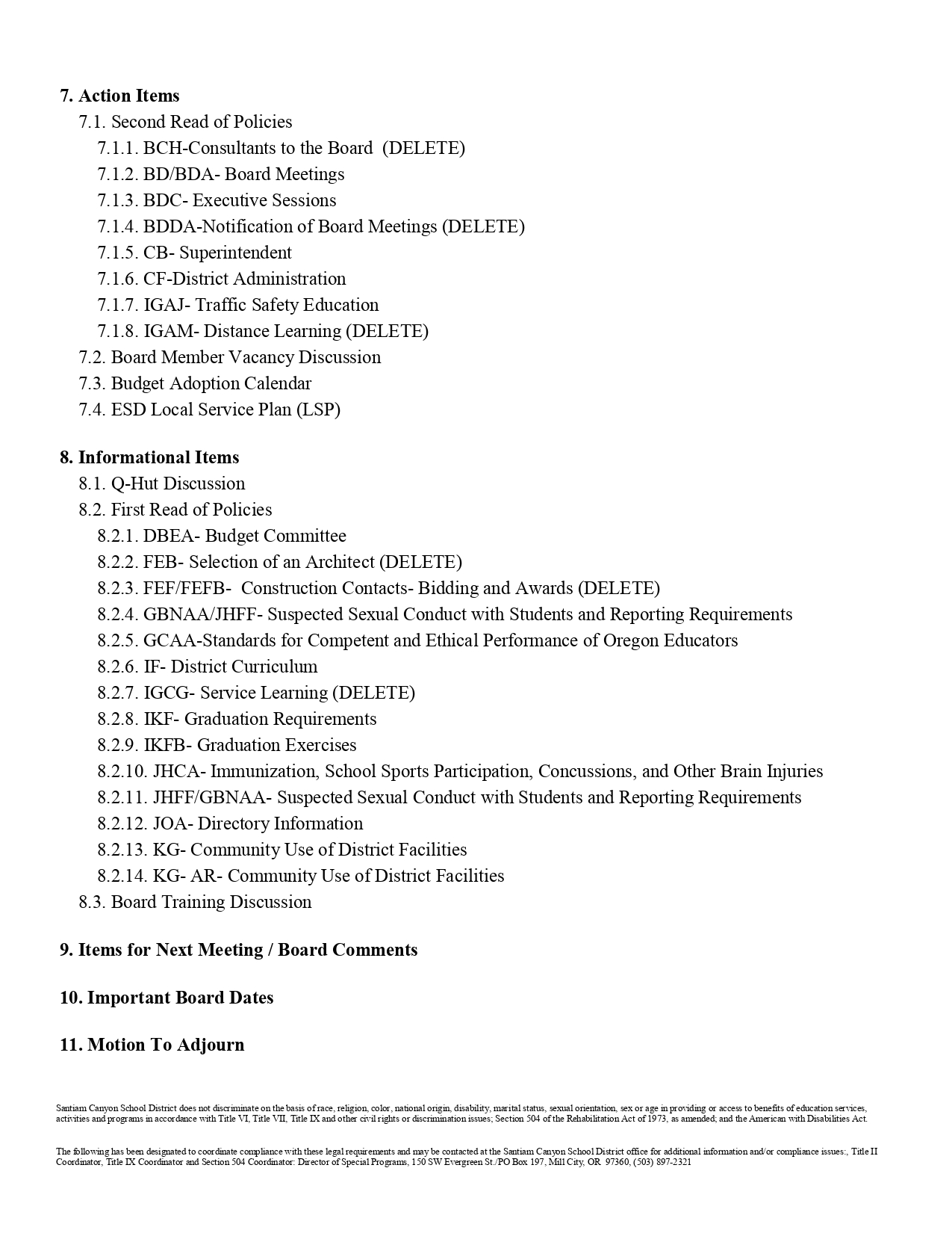 The Board of Directors of Santiam Canyon School District will have their monthly meeting on Wednesday, January 14th, at 6pm at the SES Commons. The meeting agenda is below. You can also find the meeting agenda and attachments, as well as the livestream link, at the Santiam Canyon School District (SCSD) BoardBooks website, found at the following link: https://meetings.boardbook.org/Public/Organization/3310.